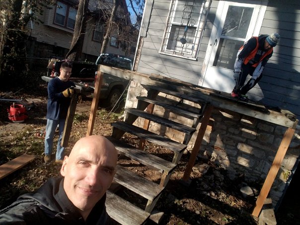 After volunteering I headed out to help re-build a deck with Tom G and Alain. Tom and I have known each other for some time, all of our kids went to school together and he and his wife are awesome. Alain is one of our contractors and has been in the states for about a year. He is originally from Cameroon, when he got to Kansas City I worked with him to get all of his stuff together and some medical help. He also stayed with me for a few months. I am also helping him send a container over to Africa and we will be going there in February to receive it. That will be a fun blog to write. Below is Tom, Alain and I. these are very good men that I completely trust and have faith in. If I was ever to need anything at anytime, I know they would be there.